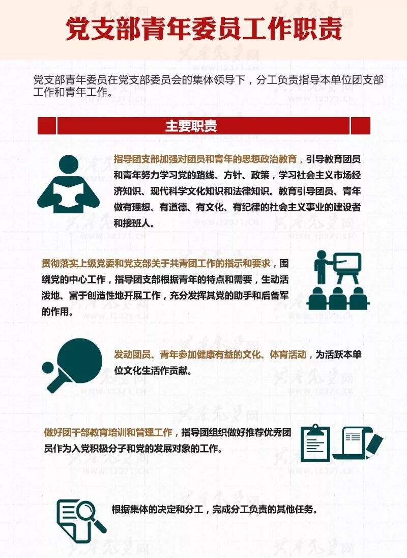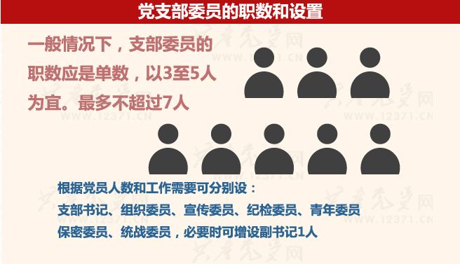 党支部委员的职数和设置,应根据党员人数和工作需要来确定。一般情况下,支部委员的职数应是单数,以3—5人为宜。最多不超过7人。可分别设支部书记、组织委员、宣传委员、纪检委员。支委多的还可以设副书记、青年委员、保密委员、统战委员等。党员人数不足7人的党支部,一般不设支部委员会,只设书记1人,必要时可增设副书记1人。支部委员会实行集体领导,有些工作不一定要设专门委员。